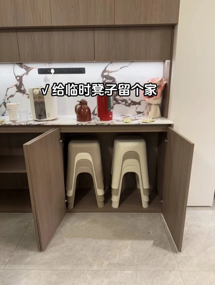 1、餐边柜留个折叠凳位——家里来东说念主多,无须满屋找凳子