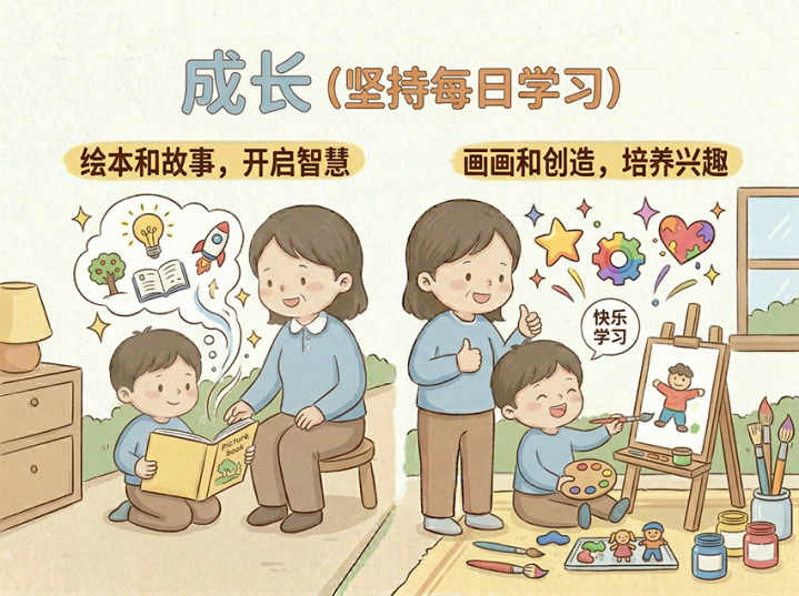 这里的“学习”,不是说认若干字、算若干数。而是养成每天看绘本、听故事、画画的好民风。