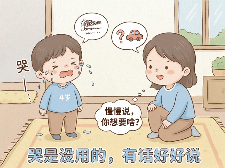 一次两次,孩子就知谈了——哭惩办不了问题,张嘴说才有效。