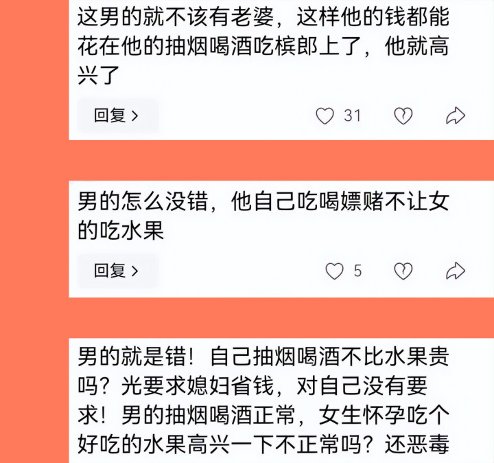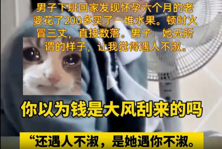 在小编看来,婚配的现实是爱、贯通和包容,要是对一个怀胎4个月的太太花200多元购买生果和零食王人不可贯通和包容。