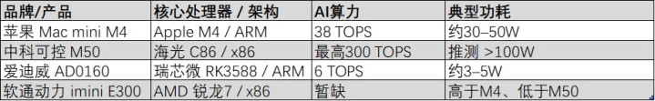 龙虾盒子芯片AI算力及功耗对比,来源:与非霸术院整理