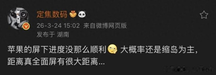 当安卓阵营纷纷上马屏下录像头时,苹果还在与“岛”较劲。距离苹果推出灵动岛已历程去近三年。这三年里,对于iPhone何时能好意思满真全面屏的辩论从未停歇。最近,博主@定焦数码 的一则爆料给期待真全面屏iPhone的用户泼了一盆冷水:苹果的屏下本事进程没那么凯旋,或者率照旧缩岛为主,距离真全面屏有很大距离。