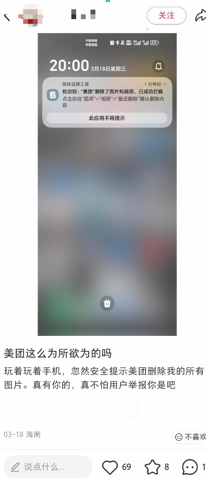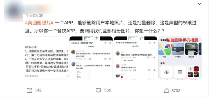 成百上千的珍稀影像贵寓片刻挥发,随之而来的是网友们巨大的蹙悚与不明:一个之外卖和土产货生涯做事为主的App,为何会有权限且有动机去大领域删除用户的土产货相册践诺?