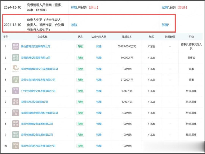值得驻防的是,2024年12月10日,深圳鹏瑞集团有限公国法东说念主发生了变更,法东说念主由徐航变更为张楠。