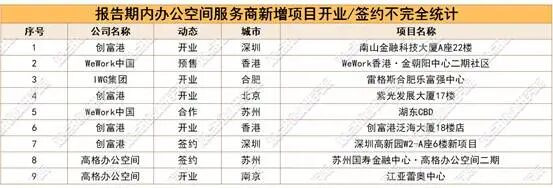 据不雅点指数监测,本期新增签约/开业的款式以为9个,触及创富港、WeWork中国、IWG集团、高格办公空间等4家样本企业,与上期比拟,本期外拓节拍彰着放缓,膨大趋于审慎。