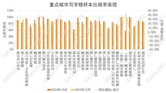 据不雅点指数统计,29个写字楼样本2025年12月平均出租率为83.86%,较2024年12月的86.58%同比下跌2.71个百分点,全体谋略压力执续表示。