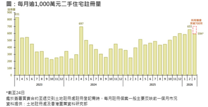 香港置业盘考部董事王品弟暗意,据地盘注册处费力清楚,本月于今(松手24日)逾1,000万元(港元,下同)二手住宅录594宗注册,较上月同时的506宗增多约17.4%;若以当今注册程度推算,料3月全月有契机冲突700宗,届时将创36个月(即3年)新高。鉴于签署生意合约至递交到地盘注册处注册登记需时,3月注册个案一般主要反应2月市况。