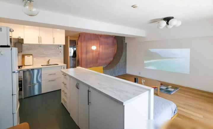 客厅更是把极简弘扬到了极致。沙发、茶几、地毯,没了。连电视墙齐省了。当今若干东谈主回家还开电视?齐是捧入辖下手机平板。不如留出空间,让我方喘语气。沙发背面的半墙柜子,既是阻隔又是餐边柜,台面还能当吧台用。一物三用,这心想花得值。