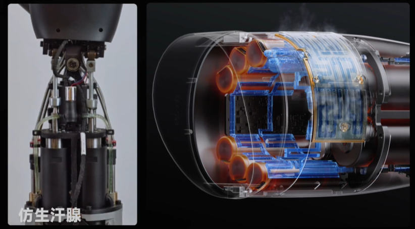在通例被迫散热外,小米尝试模拟东说念主类汗腺这种高效神气来进行主动散热(室温下 1 mL 水挥发可带走 2000 焦以上热量),在紧凑的小臂结构中,接管金属 3D 打印制作液冷轮回通说念,通过微泵将电机热量变嫌至挥发区,哄骗挥发吸热快速降温。