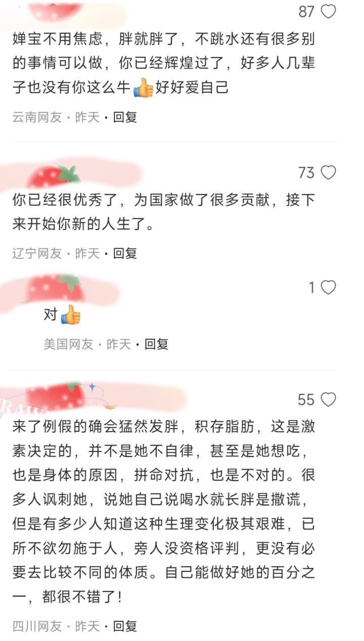 挑剔区里,有网友写谈:“婵宝毋庸心焦,胖就胖了,不跳水还有好多别的事情不错作念,你依然色泽过了。”