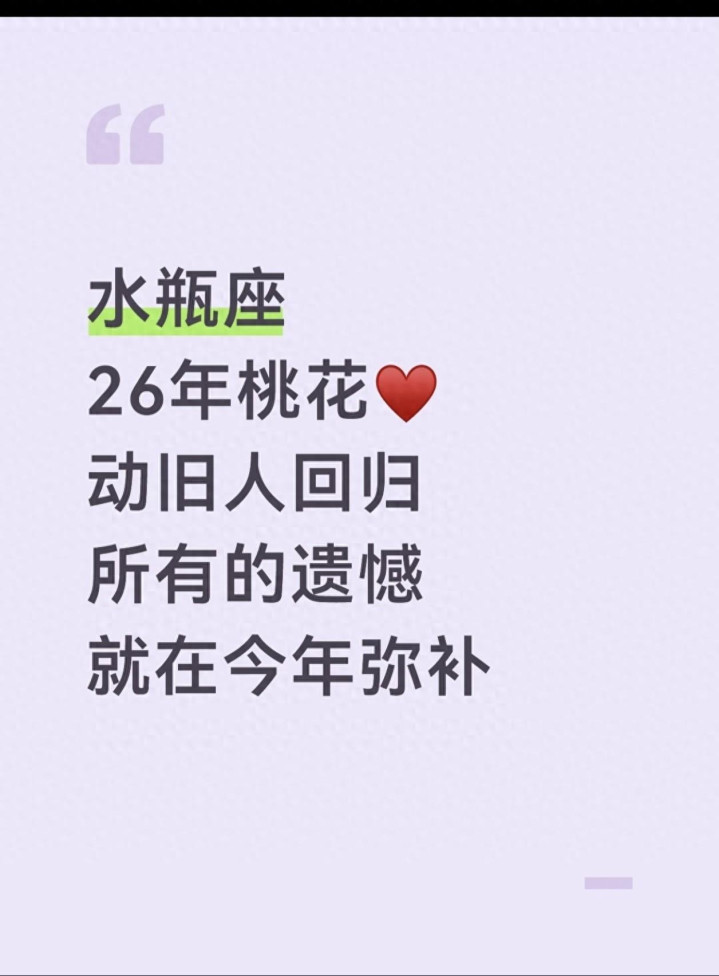 在星座的全国里,水瓶座一直是特立独行的存在。他们看重解放、想维独到,民风用理性看待全国,却时时在时势里因为“太落寞”而错过诚意。图片里那句“26年桃花动,旧东说念主追思,总共的缺憾就在本年弥补”,精确戳中了许多水瓶东说念主的苦衷。