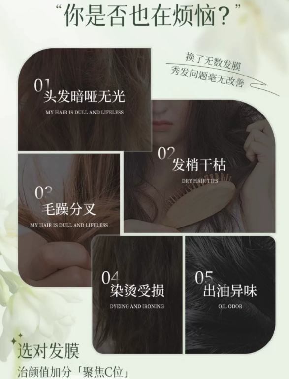 中度烫染受损 / 干枯毛躁发质:日常看护每次停留 5-8 分钟,每周搭配 1 次深度看护,厚敷发膜后用浴帽包裹停留 10-15 分钟,让修护要素充分浸透,坚捏 28 天就能看到较着改善。