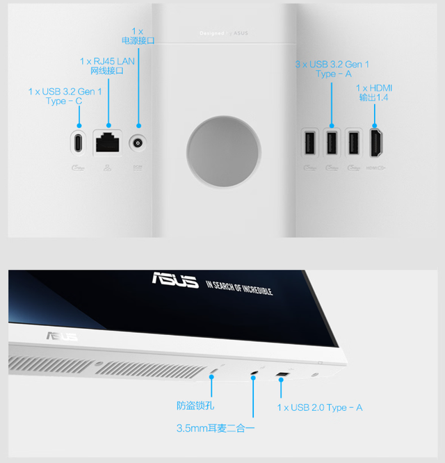 行动桌面确立,接口的丰富经过径直相关到日常使用的便利性。华硕破晓一体机配备完备接口:1个RJ45网线接口、1个USB 3.2 Gen1 Type-C、3个USB 3.2 Gen1 Type-A、1个HDMI 1.4、1个USB 2.0 Type-A、1个防盗锁孔、1个3.5mm耳麦二合一接口。岂论是连合U盘、挪动硬盘,已经外接露馅器、有线辘集,齐能平缓支吾。
