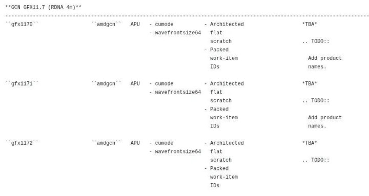 AMD正进一步推广其下一代集成GPU阶梯图,最新Linux编译器补丁揭示了两个稀疏的RDNA 4m图形主义:GFX1171和GFX1172。