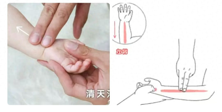 这个格式就藏在孩子手臂内侧,从手腕的横纹到胳背肘的横纹,中间这一条直直的线,即是环节。操作时,大东谈主把食指和中指并拢,蘸点温水或者姜汁,沿着这条线,从手腕往胳背肘的标的单向推,别往复搓,只朝着一个标的走,推起来又快又匀。